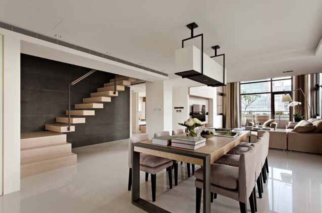 经过设计规划,客厅与餐厅的家具高度一致,从厨房中岛望向客厅的视野舒服无压,更可直接眺望窗外的101大楼。而餐厅旁的阳台区域则是全室最佳的观景平台,简单放置一张单椅,坐看月升星移就很惬意。而餐厅处的楼梯则以光梯悬空设计,仿佛跃动向上的音符,至于楼梯间端景平台的雕塑作品则是对房主有着重大意义的纪念品。巧妙地安排并结合穿透式设计,从楼梯间、主卧室及客房皆能见到。
