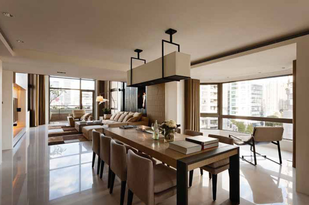 3. 设计比例 :经由设计规划,客厅与餐厅的家具高度一致,从厨房中岛望向客厅的视野舒服无压,更可直接眺望窗外的101大楼。
