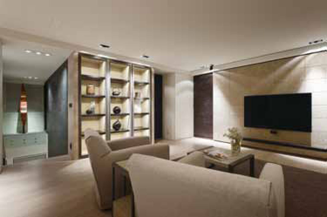 顺着艺文廊道进入公共领域,深色的钢刷木纹背景墙辅以线条优美的雕塑作品,以大器之姿来展现豪宅的艺术气息。延伸为6米高的电视墙以削光石材搭配木皮,在棉麻材质窗纱的光线调节中,营造出温润的空间质感。