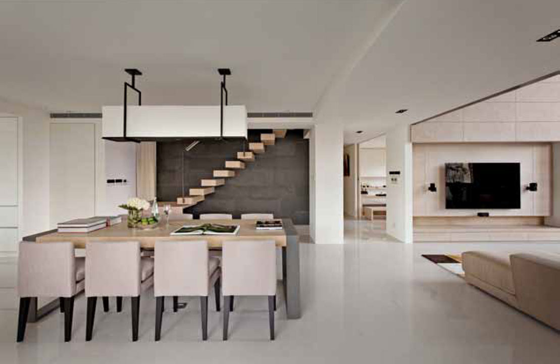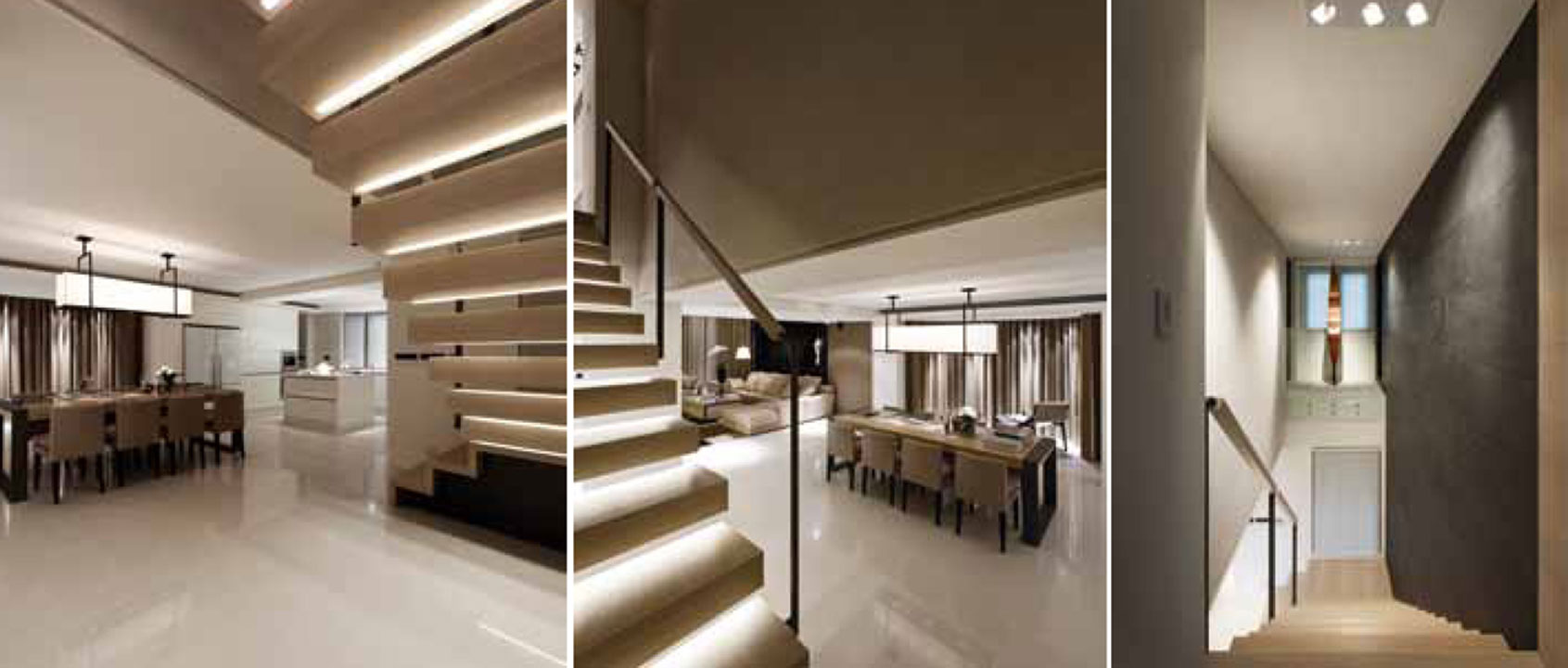 经过设计规划,客厅与餐厅的家具高度一致,从厨房中岛望向客厅的视野舒服无压,更可直接眺望窗外的101大楼。而餐厅旁的阳台区域则是全室最佳的观景平台,简单放置一张单椅,坐看月升星移就很惬意。而餐厅处的楼梯则以光梯悬空设计,仿佛跃动向上的音符,至于楼梯间端景平台的雕塑作品则是对房主有着重大意义的纪念品。巧妙地安排并结合穿透式设计,从楼梯间、主卧室及客房皆能见到。
