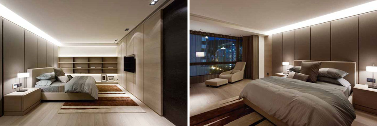 卧室:浅色铺陈的卧室,设计师借助光体的变化增添层次氛围。