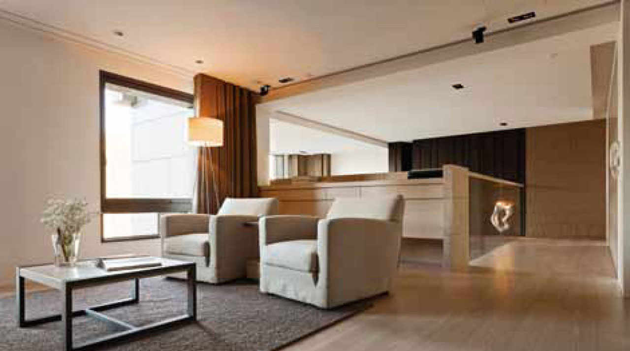 起居室:舒适的单人沙发及玻璃茶几的设计,让视野串连上下空间。