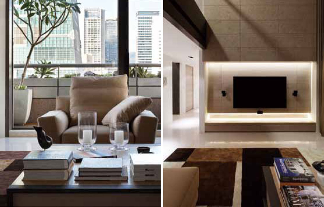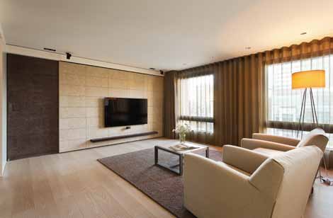 顺着艺文廊道进入公共领域,深色的钢刷木纹背景墙辅以线条优美的雕塑作品,以大器之姿来展现豪宅的艺术气息。延伸为6米高的电视墙以削光石材搭配木皮,在棉麻材质窗纱的光线调节中,营造出温润的空间质感。