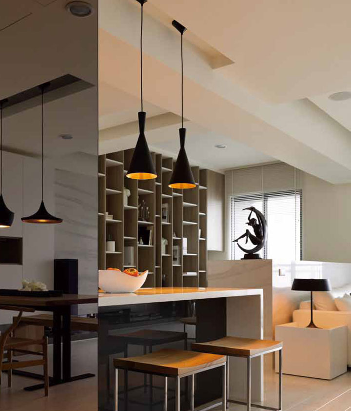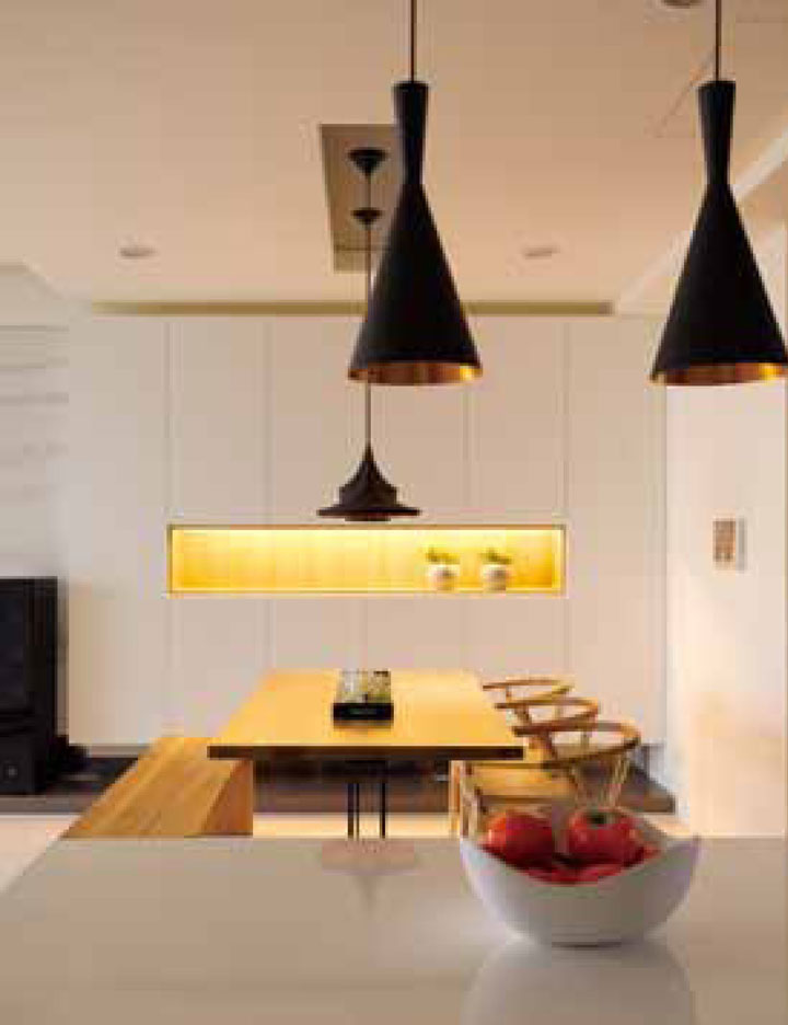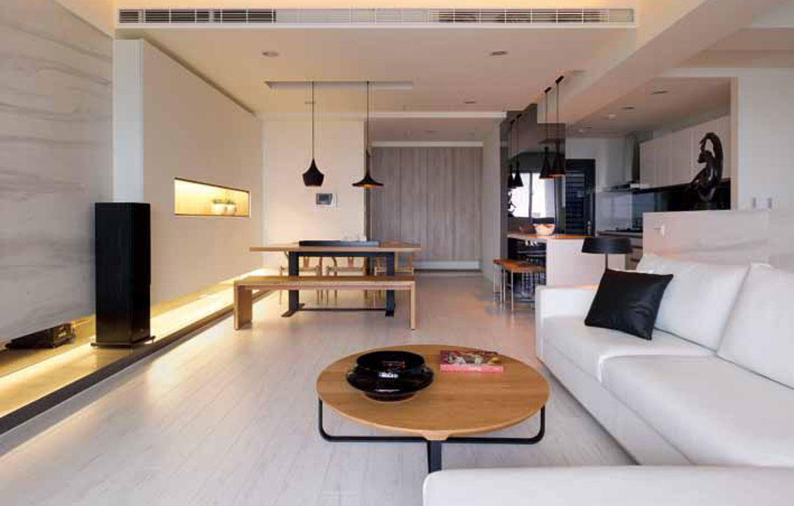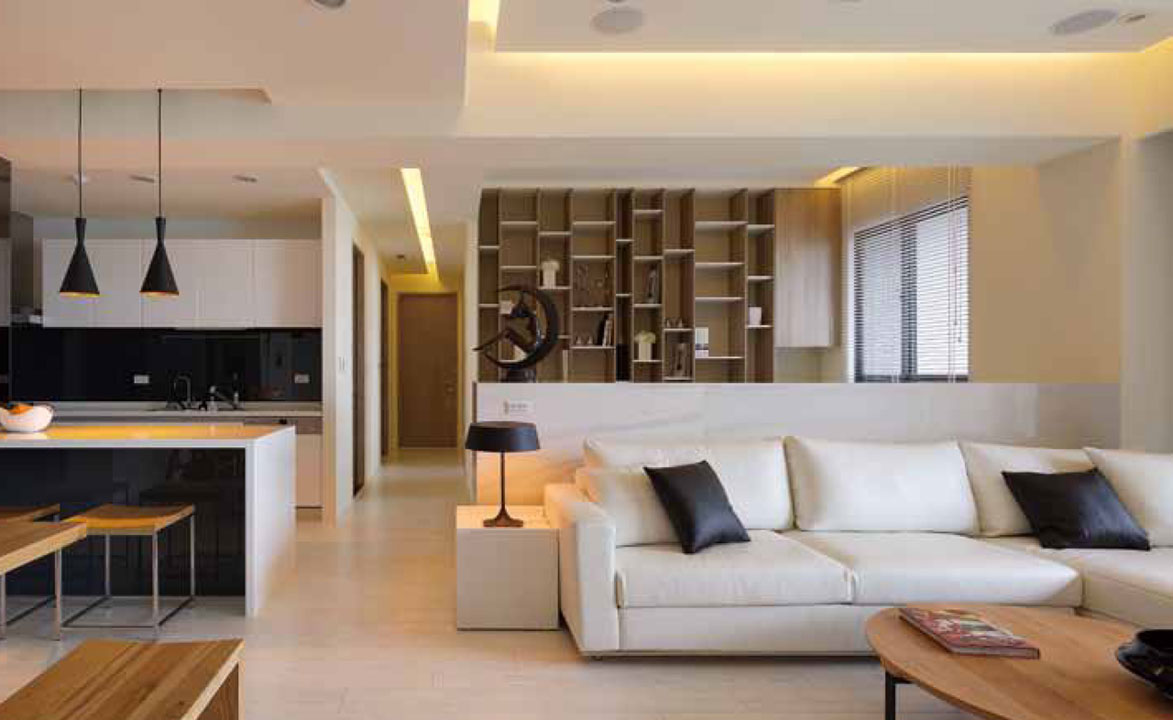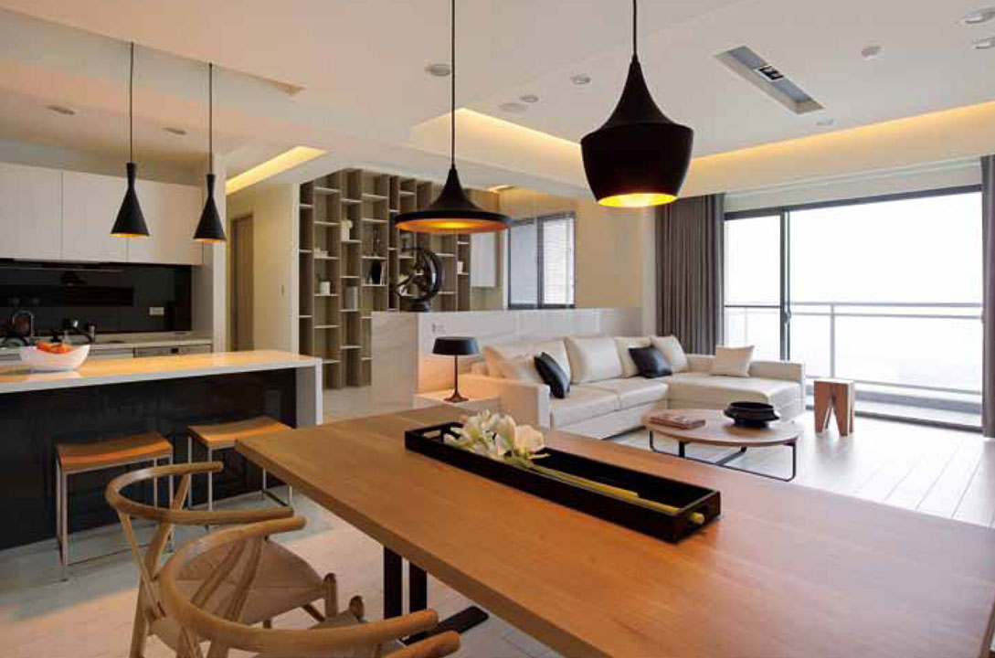 五合一空间:为了让格局呈现敞朗的开阔,设计师辙掉书房隔断,整合出玄关、客厅、餐厅、厨房、书房,表现五合一的大空间。