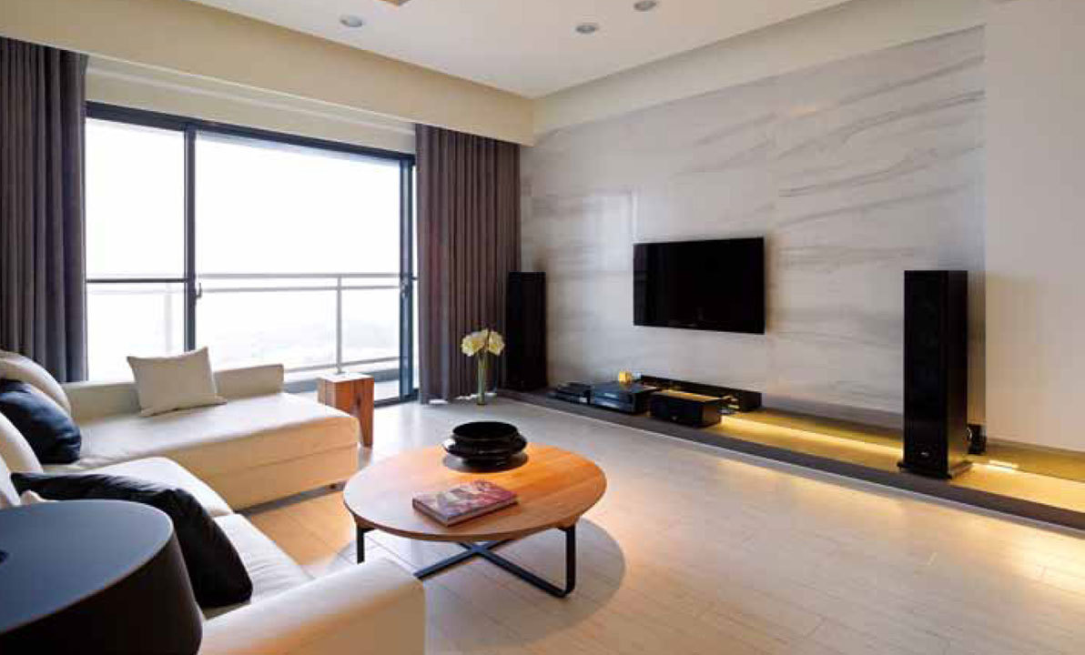 在色彩的设置上,以浅色白为主,从电视主墙上的进口磁砖到系统展示柜体都有所体现,再衬以原木跳色以丰富层次感,延续木作与石材的自然表情,书房半高墙与木作柜体,铺叙出男女主人在家中共事时的温婉格调;在软件上,纯白沙发搭配上超耐磨木地板,烘衬温润度。延续着公共领域的木皮色系,使主卧空间呈现出饭店般的质感,窗边卧榻则有着实用的收纳功能。