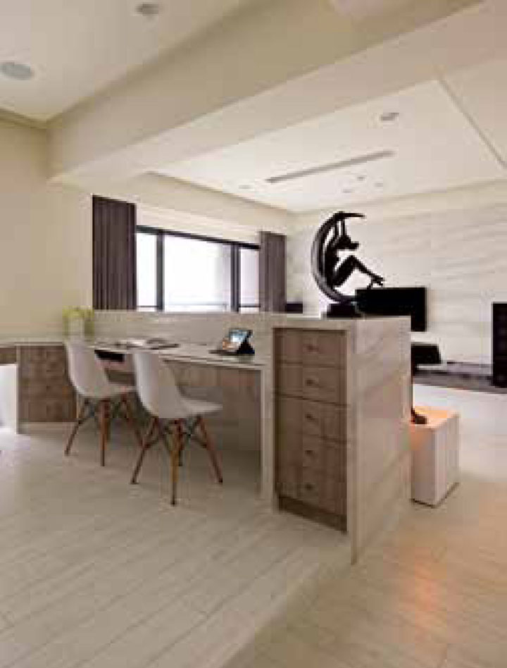 为让格局呈现敞朗的开阔,设计师建议重新规划格局,另外考虑到男主人从事科技工作的需求,以及女主人擅长缝纫的喜好,为之打造梦想中的大书房,不仅可自在地从事打版等事务,还可有3到4人宽敞互动的空间。