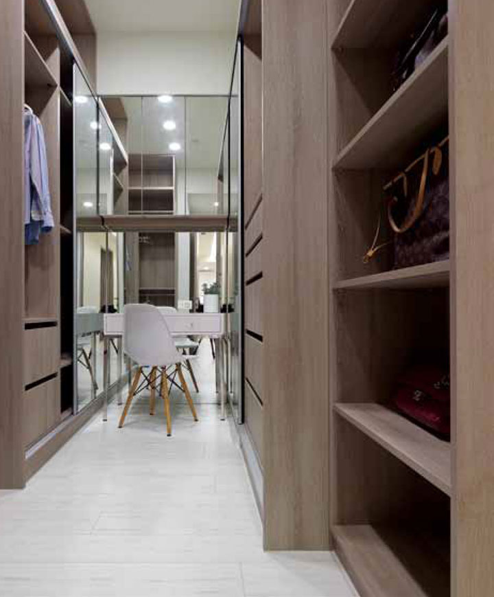 主卧更衣间:在空间底端运用镜面反射特性,即使是狭长的更衣间也有了无尽的视觉延伸。