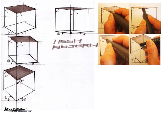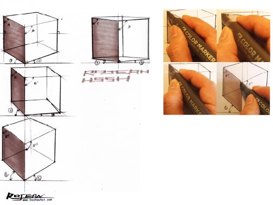 用马克笔画立方体左侧面时,起笔位置可定在最左边的边缘线,从立方体最左侧边线着手,从左至右滑动马克笔笔头。