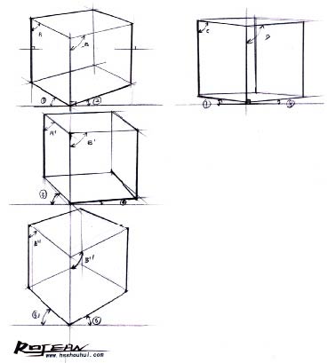图中四个立方体分别是四个不同角度,观察这四个立方体的视平线位置也不一样,离视平线越近,在视平线下方立方体的顶面就越小,离视平线越远;在视平线下方立方体的顶面面积就越大。
