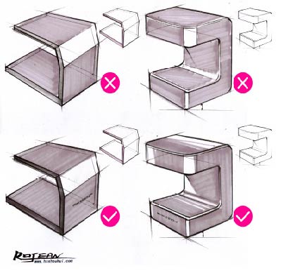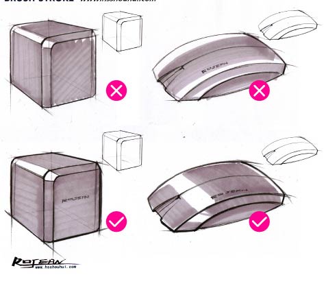 同一个造型,当马克笔运用不同方向的笔触得到的效果图是完全不一样的,下图第一行是错误的运笔方向,第二行是正确的运笔方向。