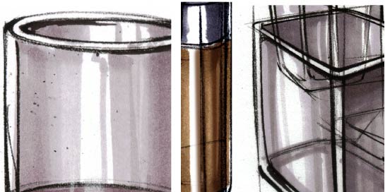 当遇到立方体倒角以及弧面造型产品时,马克笔运笔要尽可能地按照造型的面体来滑动,这样可以事半功倍,用最少的笔触塑造出最丰富的效果。