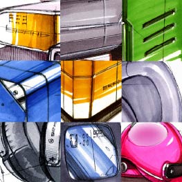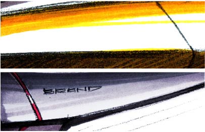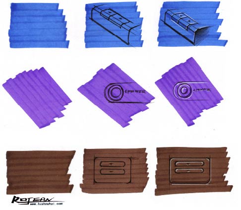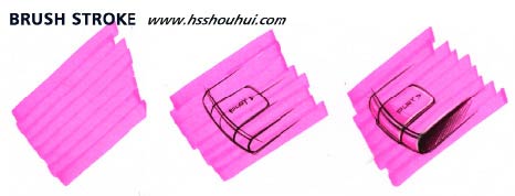 运用马克笔铺颜色时,笔头画出来的笔触有一个要遵循的原则就是必须跟着产品造型走,初学者可以理解成是类似于素描的方法,因为在工业产品手绘效果图中,马克笔上颜色的画法和排线有点像素描,不过对于初学者来讲马克笔的笔触与排线往往在练习的时候无从下笔,初学者通常画出来的笔触位置不准确,感觉笔触在画面中晃动,显得很乱。通常情况下,笔触之间的组合要呈现出一定的韵律,不要留出很明显的笔触痕迹。