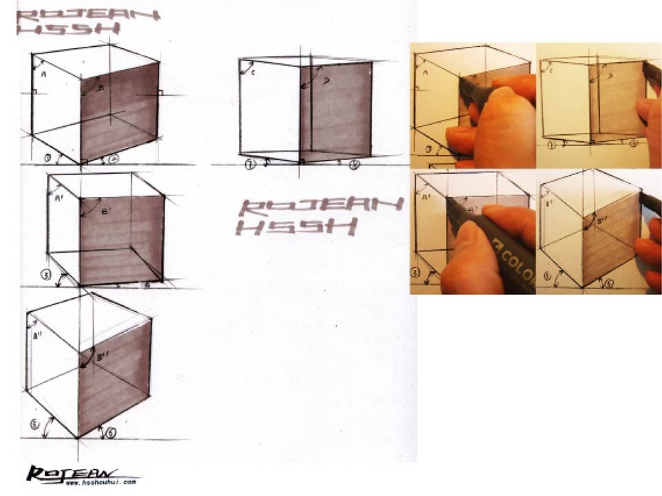 展现在我们视线范围内的有立方体的顶面、左侧面、右侧面。我们分别对立方体三个面的排线方式进行了分析,首先是用马克笔画立方体的顶面,顶面相对其他面更窄,用马克笔上色时,笔杆与纸面夹角角度可尽量缩小,从起笔时间(笔触头部)到收笔时间(笔触尾部)控制在0.5秒(正负0.3秒)左右。