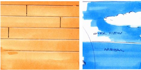 大面积的上色区域要绘制均匀,体现自然渐变效果,需要快速落笔,马克笔笔头与纸面的摩擦要快,上一笔还没有干,下一笔就要迅速叠加在上面。有一个比较重要的因素是要始终让手臂移动速度保持匀速,这也是一个小经验。