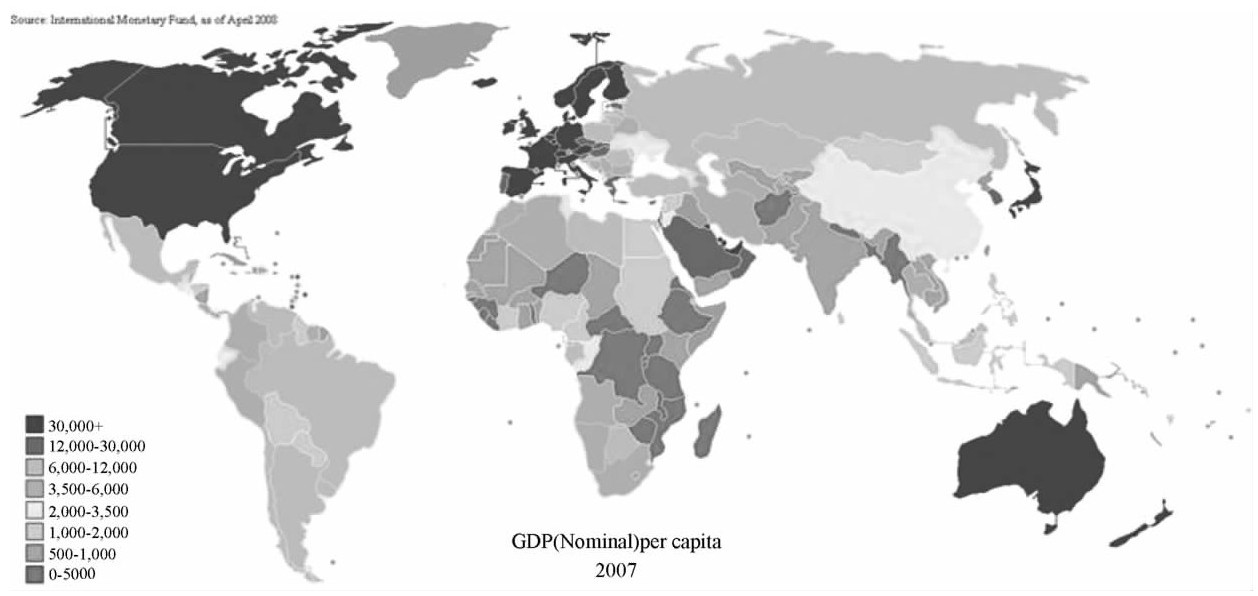 图1-2 世界经济版图(全球人均GDP分布,2007IMF数据)
