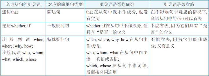 在《英语语法新思维中级教程——通悟语法》里,我们具体讨论了陈述句、一般疑问句和特殊疑问句是如何按照一系列规则进行变化后才能充当四种句子成分的,在此不再赘述。下列表格给出了名词从句的引导词与简单句之间的对应关系。请注意这些名词从句的连接词的用法特点。