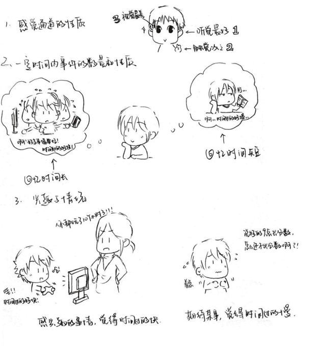 在一定时间内,事件发生的数量越多,性质越复杂,人们倾向把时间估计得越短;事件的数量越少,性质越简单,人们倾向于把时间估计得越长。但是在回忆往事时,情况正好相反。同样时间内的经历,经历越丰富,越觉得时间长,经历越简单,越觉得时间短。