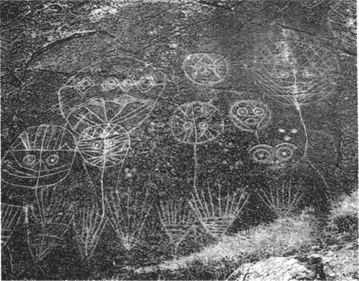 岩画分为3组。第一组位于西部,长4米,宽2.8米。刻有人面、兽面和禾苗图案,并有9个符号。最大的人面高90厘米,宽110厘米,头上刻一高32厘米、宽88厘米的尖圆顶饰物,上部为一复线半圆形图案,沿部刻有上下相对菱形的复线三角纹,中以弦纹分开。人面的口部与另一个人面的头部相接。眼睛以两条线勾出眼皮,再以3条横线表示眼睛。腮部刻有许多与五官无关的杂乱线条。其他人面的眼睛皆是在同心圆中加一圆点表示。人面大都有一条贯通的直线向下与禾苗图案相连。这一组还有两个不加脸框的人面图案,与龙山文化玉器、良渚文化玉器上的兽面纹极相似。禾苗图案分为2种:一种由下向上刻4~8根呈辐射状的线条;另一种是在第一种图案的下部加一个三角形,中刻几条横线或圆点。