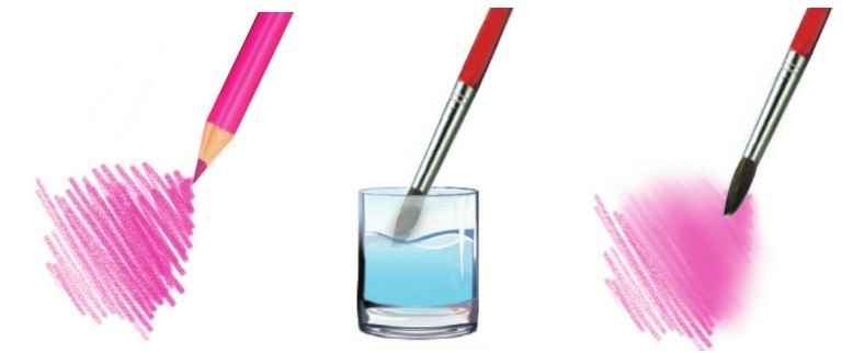 使用毛笔涂抹可溶性色铅笔笔触