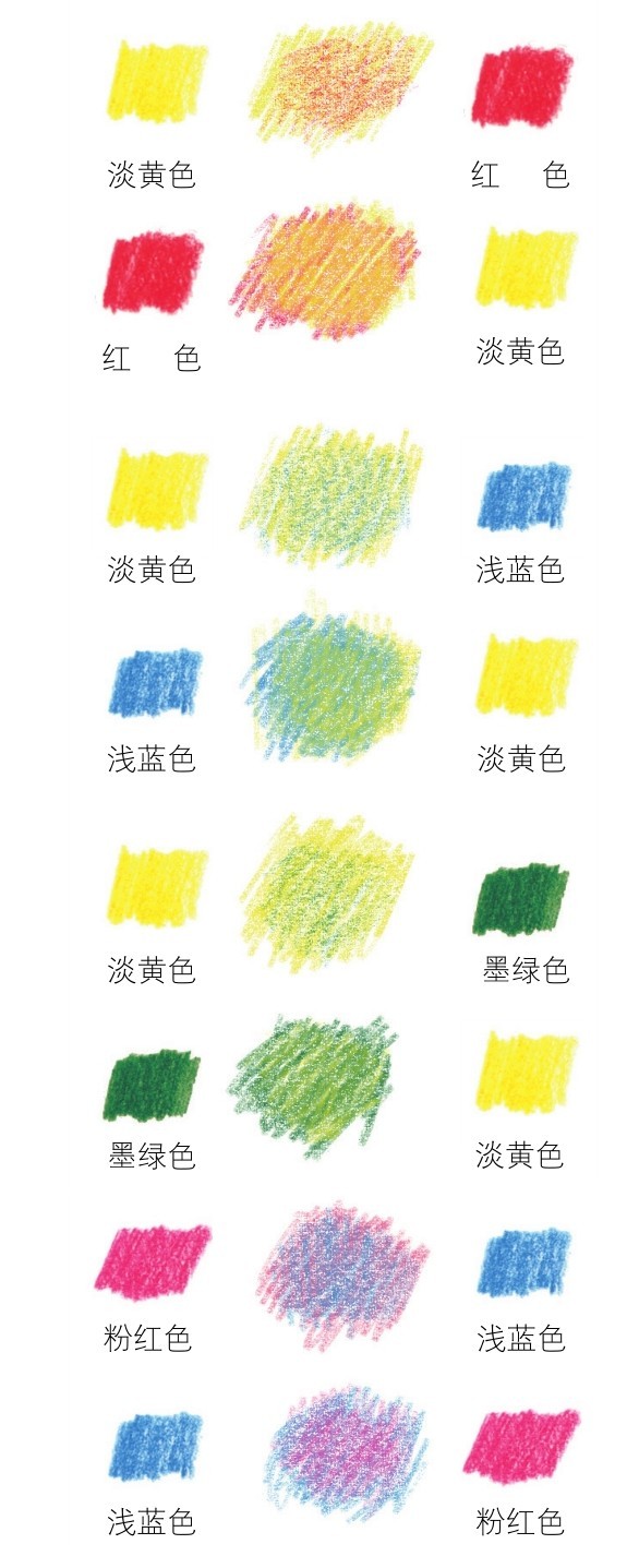 利用色铅笔重叠混色的效果,可以创造出许多不一样的色彩。当两种颜色重叠时,画出的先后顺序也会影响色彩的变化。