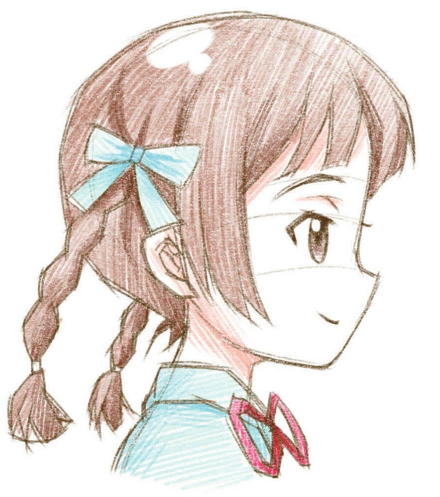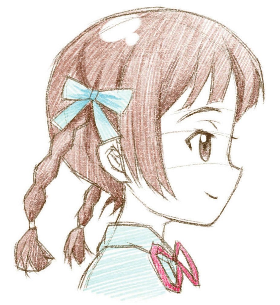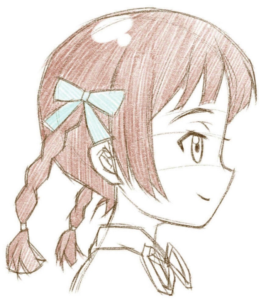 2 用浅棕色、水蓝色绘制出女孩头发和发饰的颜色,注意留出头发的高光点。