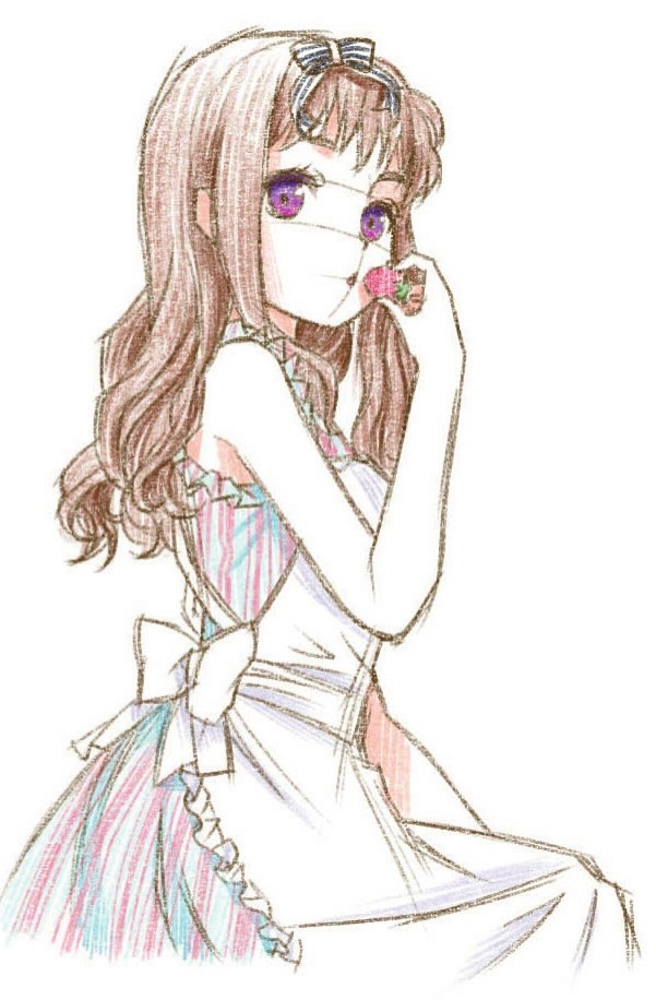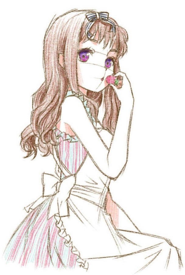 3 用熟褐色画出女孩头发的暗部颜色,用黑色画出头发上发饰的条纹。用生褐色、紫色、紫红色、玫瑰红画出眼睛的颜色。用红色、浅绿色画出手中草莓的颜色,用水蓝色画出裙子的底色。
