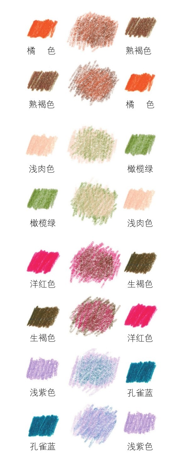 若想要多叠加几层颜色,可在草稿纸上先交替试验几次。因为有些配色交叠在一起后会呈现混浊的状态,所以想要用色铅笔画重叠色,要多次试验才行。