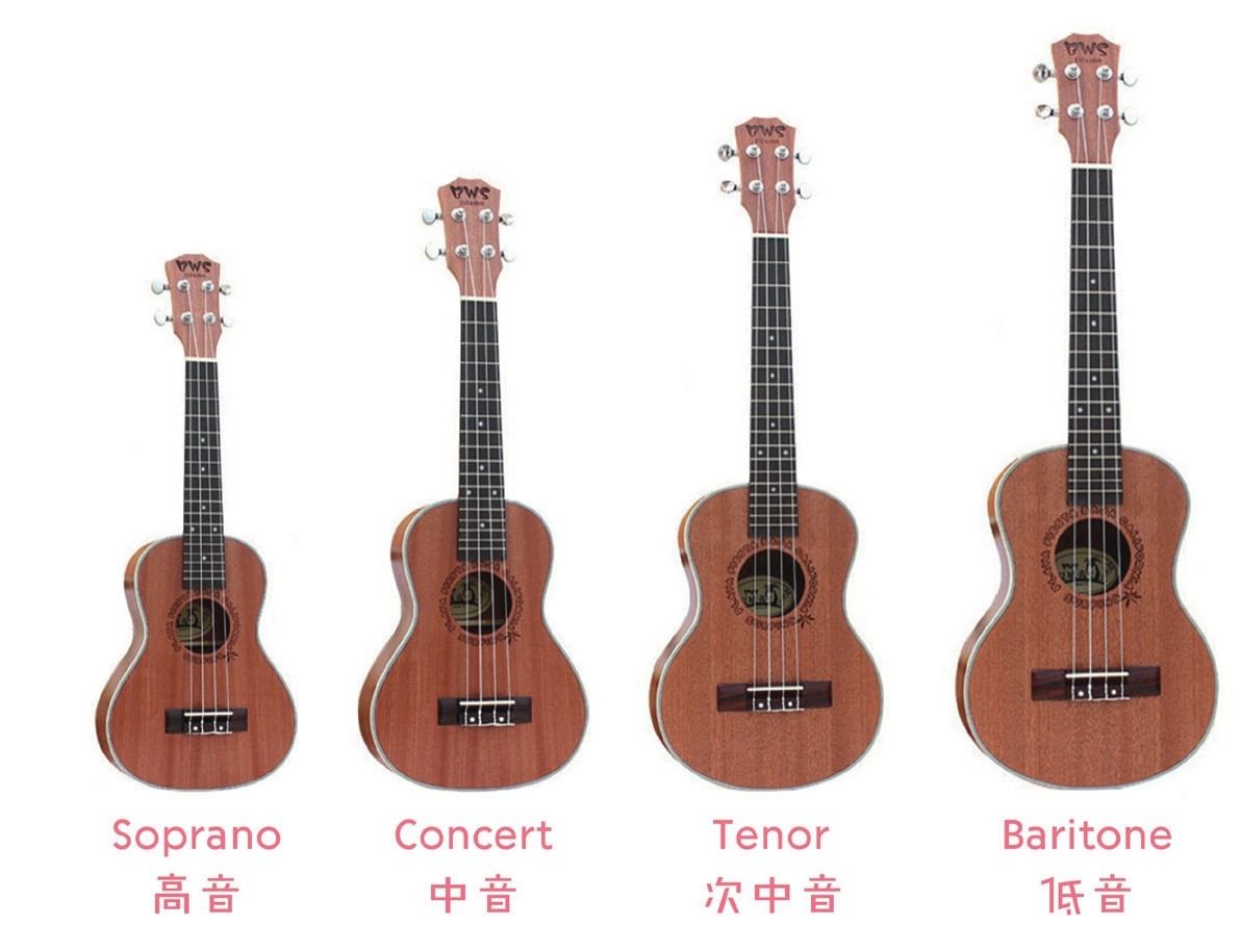 依照尺寸来分,尤克里里可以分为21英寸Soprano(高音)、23英寸Concert (中音)、26英寸Tenor(次中音)和30英寸Baritone(低音)四种,简称为S型、C型、T型和B型。
