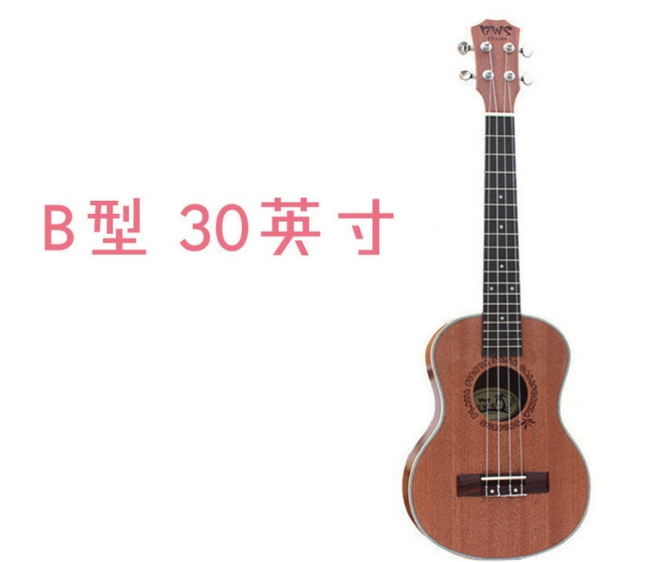这种琴型比较少见,琴长可达30英寸,快赶上一把旅行吉他的尺寸了,它的调音和S型、C型和T型的尤克里里不一样,相对音域低一些,跟吉他的调音相似。其实你已经可以把它看成一个少了5弦和6弦的吉他。