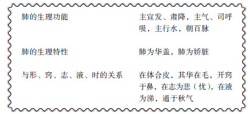 肺在体合皮,其华在毛,在窍为鼻,在志为悲(忧),在液为涕。肺与大肠相为表里,通过手太阴肺经、手阳明大肠经相互络属。肺在五行属金,与秋气相通应。