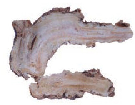 形态特征:根圆柱形,有的有分枝,上端较粗,略扭曲,表面淡棕黄色至淡棕褐色,有不规则纵皱纹及横长皮孔,栓皮易剥落而露出黄白色皮部,有的可见网状纤维束。