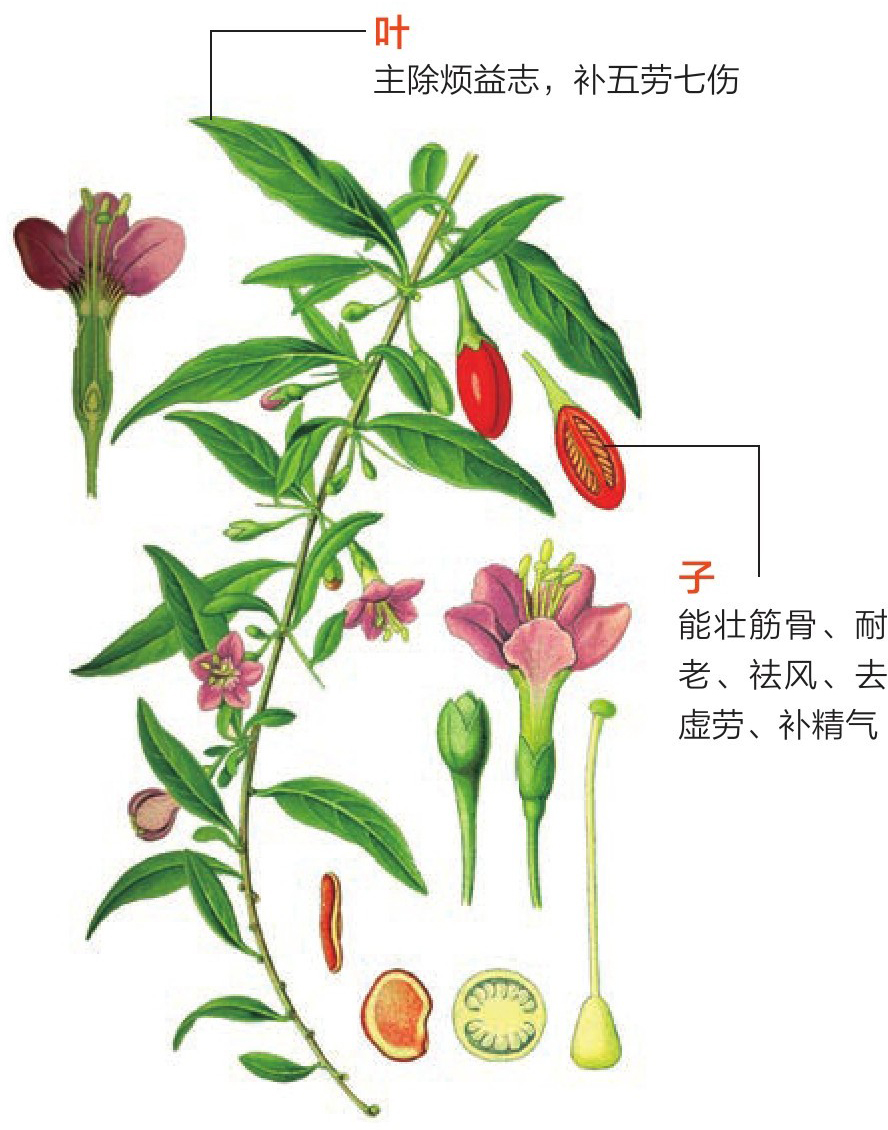 枸杞是茄科枸杞属的多分枝灌木植物,高0.5~1米,栽培时可达2米多。国内外均有分布。枸杞全身是宝,明李时珍《本草纲目》记载:“春采枸杞叶,名天精草;夏采花,名长生草;秋采子,名枸杞子;冬采根,名地骨皮。”现代研究表明,枸杞子有降低血糖、抗脂肪肝的作用,并能抗动脉粥样硬化。