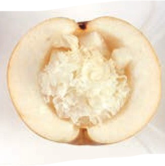 2.水梨从蒂柄上端平切,挖除中间的籽核。