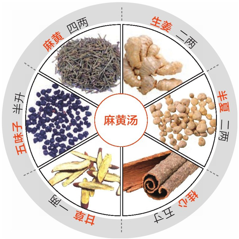 麻黄四两,生姜、半夏各二两,桂心五寸,甘草一两,五味子半升。