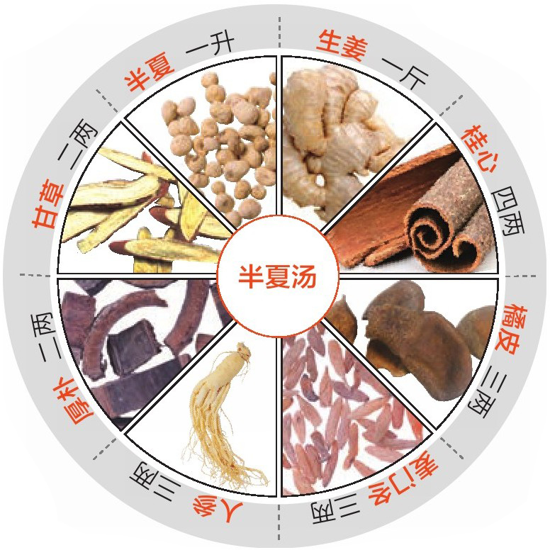 半夏一升,生姜一斤,桂心四两,橘皮、麦门冬、人参各三两,厚朴、甘草各二两。