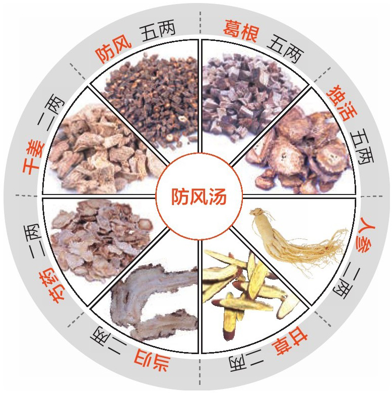 防风、葛根、独活各五两,人参、甘草、当归、芍药、干姜各二两。