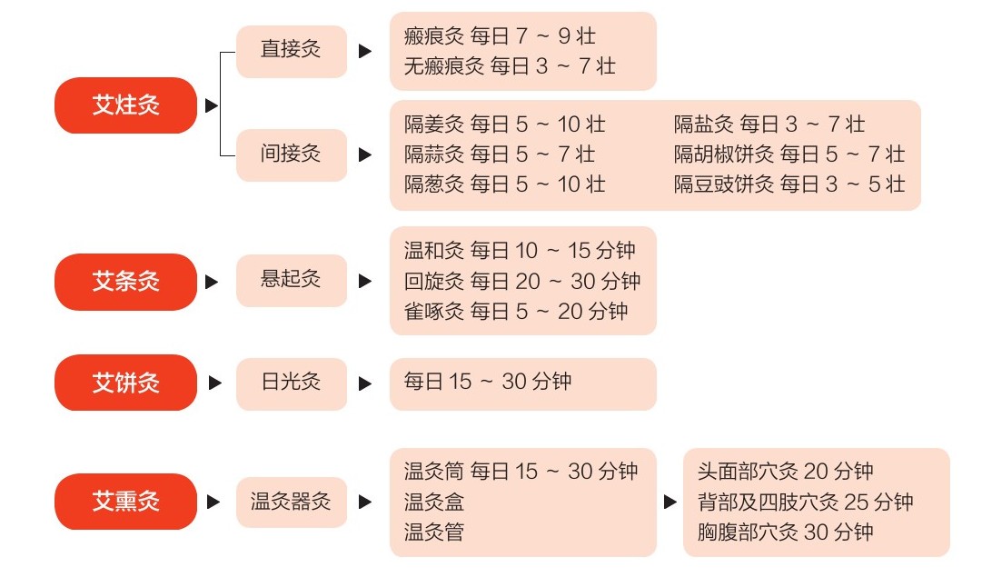 一般按照每次施灸累计总和数来算,施灸壮数少则1~3壮,多则数十壮乃至数百壮。前3日每日灸1次,以后每隔2~3日灸1次,急性病每日可灸2~3次;慢性病隔3日、5日或7日灸1次,保健灸每月可灸3~4次,终身坚持施灸,可延年益寿。身体健壮、生病频率低的青壮年患者,所用艾炷宜大,壮数宜多。小儿、妇女、老人及久病体弱之人,所用艾炷宜小,壮数宜少。在肌肉丰厚的腰背、臀腹、臂等处宜用大炷多灸;在肌肉浅薄的头面、颈项、四肢末端宜用小炷少灸。直接着肤灸,一般以麦粒大小艾炷为宜,每穴灸5~7壮,小儿3~5壮,每次灸3~5穴。使用艾灸急救时,不用具体计算壮数,直到患者心跳神志恢复正常为止。