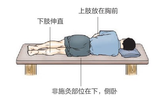 具体要求:非施灸部位在下,侧卧,上肢放在胸前,下肢伸直,同时充分暴露施灸部位