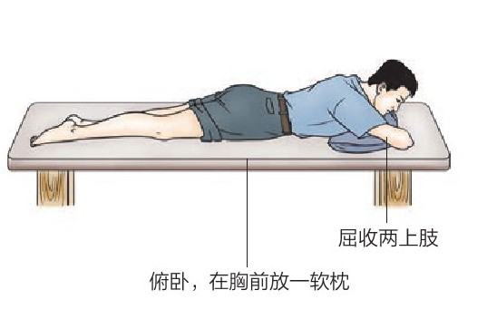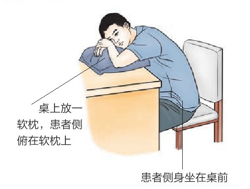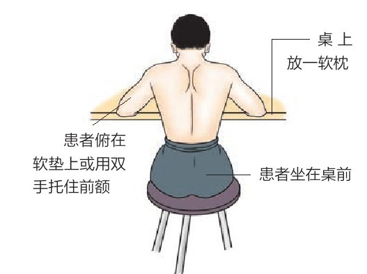 具体要求:患者坐在桌前,桌上放一软枕,患者俯在软垫上或用双