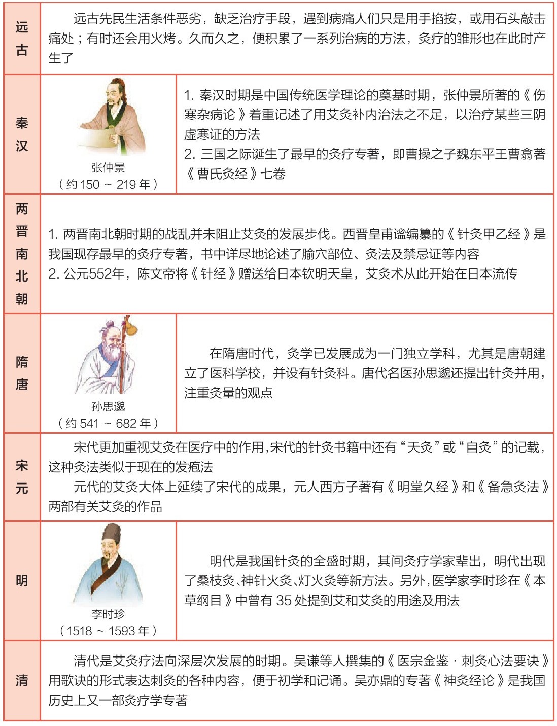 东汉时期艾灸有了进一步发展。张仲景所撰写的《伤寒杂病论》1中记载了不少用艾灸治疗某些三阴虚寒证的方法。成书于西汉末年至东汉延平年间的《黄帝明堂经》是我国第一部有成熟体系的、针灸并重的腧穴学经典著作,该书为艾灸对症取穴治疗奠定了基础。