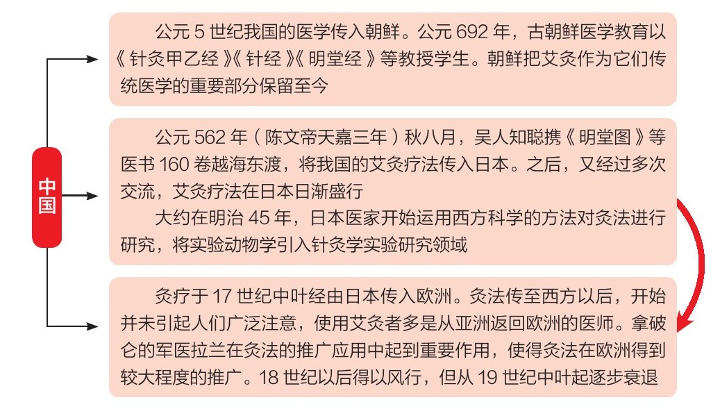 南北朝时,灸疗不仅在民间盛行,而且传入了日本。公元552年,陈文帝将《针经》赠送给日本钦明天皇,艾灸术从此开始在日本流传。公元562年秋,吴人知聪携《明堂图》等医书160卷越海东渡,以后,日本多次派人来我国学医。灸术传入日本后深受朝野重视,发展迅速。