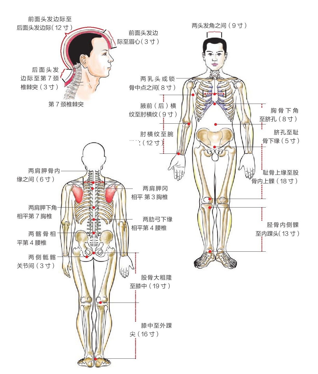 说明:用在头部,前额部及后颈部的直寸。当头发稀少,前后发的边缘不清楚时,可从眉心至后颈最高的第七颈椎骨下缘作18寸,其中眉心至前发际为3寸,后发际下也加了3寸