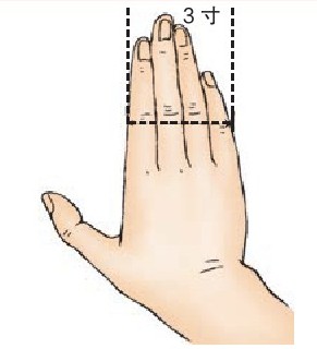 3.横指同身寸:又称“一夫法”。食指、中指、无名指和小指并拢,以中指第二节纹线处四横并紧后的共同横行长度为“一夫”,四指宽度为3寸。适用于下肢、腹部和背部取穴的直寸。