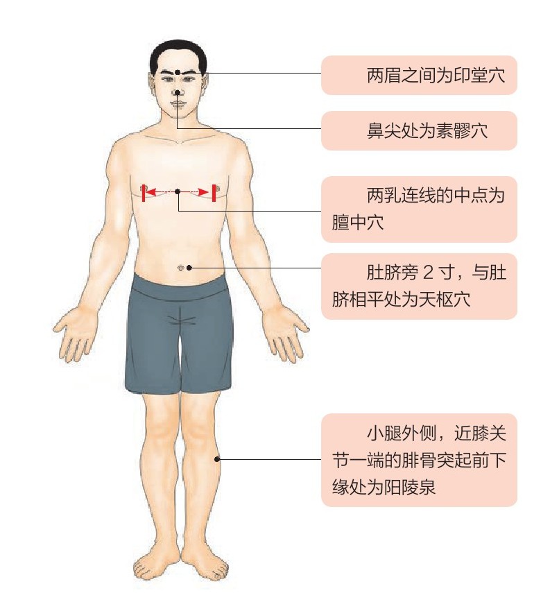 说明:女子可取两锁骨中点之间的距离作8寸,用在胸腹部