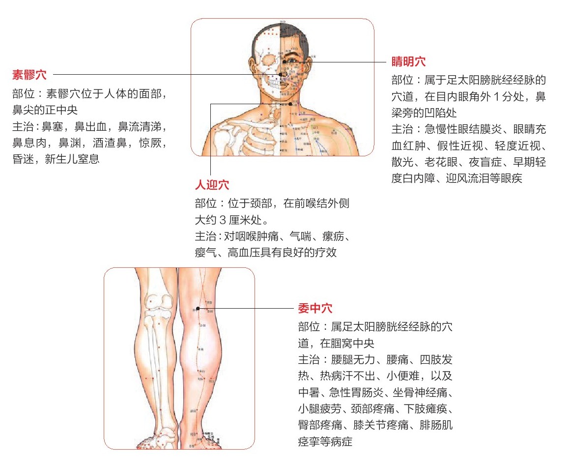四肢部:天府、阳池、中冲、少商、鱼际、经渠、地五会、隐白、漏谷、阴陵泉、条口、犊鼻、阴市、伏兔、髀关、申脉、委中、殷门、承扶