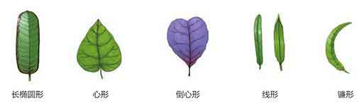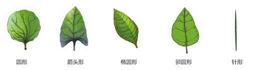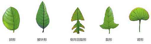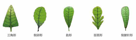 首先是植物叶子的形状,即叶形。叶形大致有三角形、倒卵形、匙形、琵琶形、倒披针形、长椭圆形、心形、倒心形、线型、镰形、卵形、披针形、倒向羽裂形、戬形、肾形、圆形、箭头形、椭圆形、卵圆形、针形等几种,如下图所示: