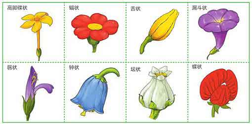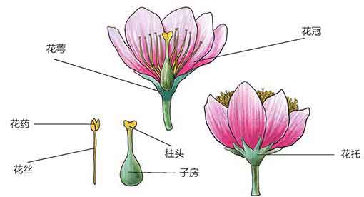 花朵是种子植物的有性繁殖器官,可以为植物繁殖后代。它的各部分轮生于花托之上,四个主要部分从外到内依次是花萼、花冠、雄蕊群、雌蕊群,如图解: