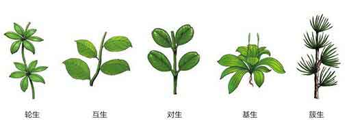 叶序是叶在茎上排列的方式,它的类型包括簇生、互生、对生、轮生、基生,如图: