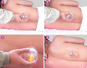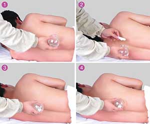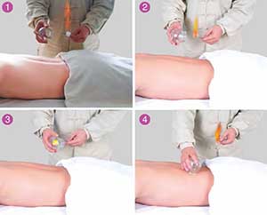 先将水在壶内煮沸,当水蒸气从壶嘴或套在壶嘴上的皮管内大量喷出时,将罐子套在喷气口上2~3秒钟,然后迅速将罐子倒扣在拔罐部位上。扣住后,用手按住罐底约半分钟,使之吸牢。此法适用于各种体位。