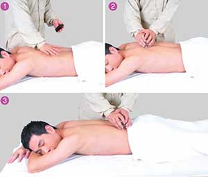 首先将要拔罐的部位暴露出来,术者靠近患者身边,按照选用的方法将罐具倒扣在患者皮肤上。一般罐具的排列有两种方法: